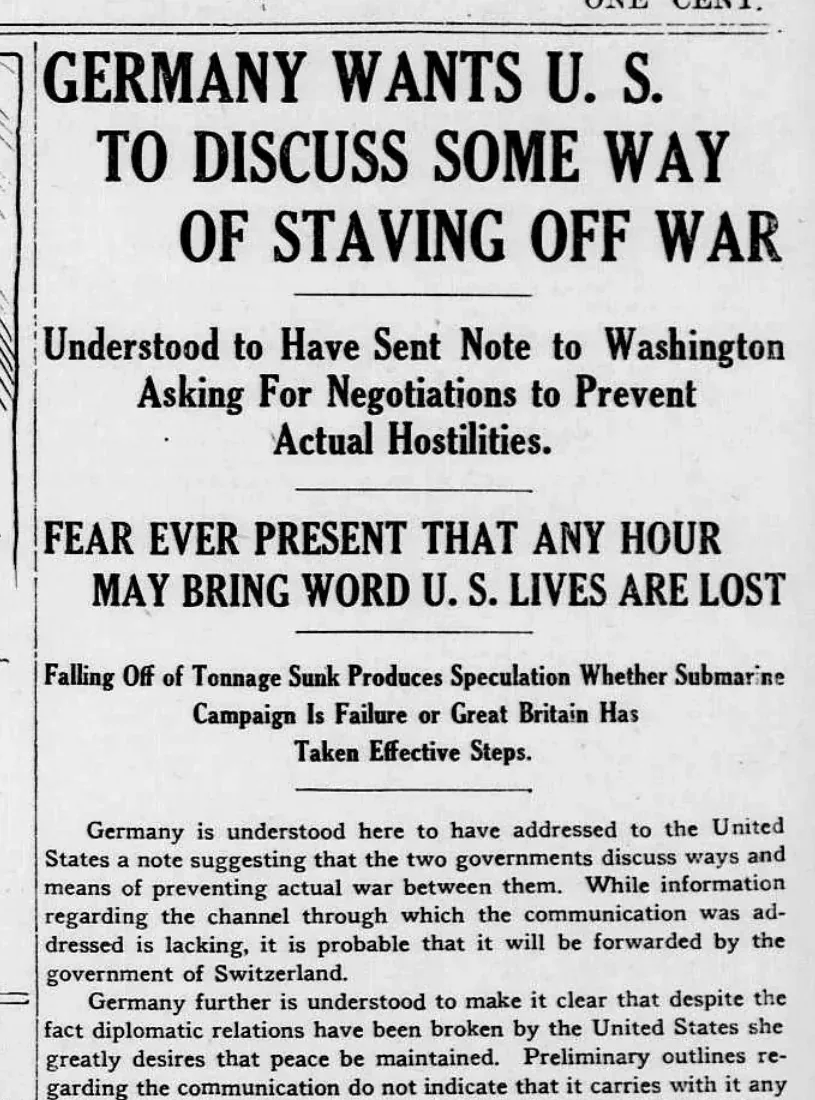 Evening-Star紙の1917年2月10日付一面記事。ドイツがスイスを通じて対米戦争回避の協議を望んでいたことを報じる