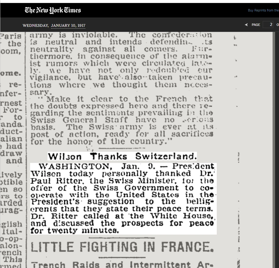 Die Kritik kam nicht nur aus den USA. Am 20. Februar 1917 veröffentlichte das Journal de Geneve den Artikel «Une leçon pour notre diplomatie». Dort hiess es, der Bundesrat und das Politische Departement seien an Ritters Vorstoss nicht beteiligt gewesen. Dem Schweizer Minister in Washington wurde stattdessen ein Missverständnis und ein «excès de zèle regrettable», also ein bedauerlicher Übereifer, zugeschrieben.