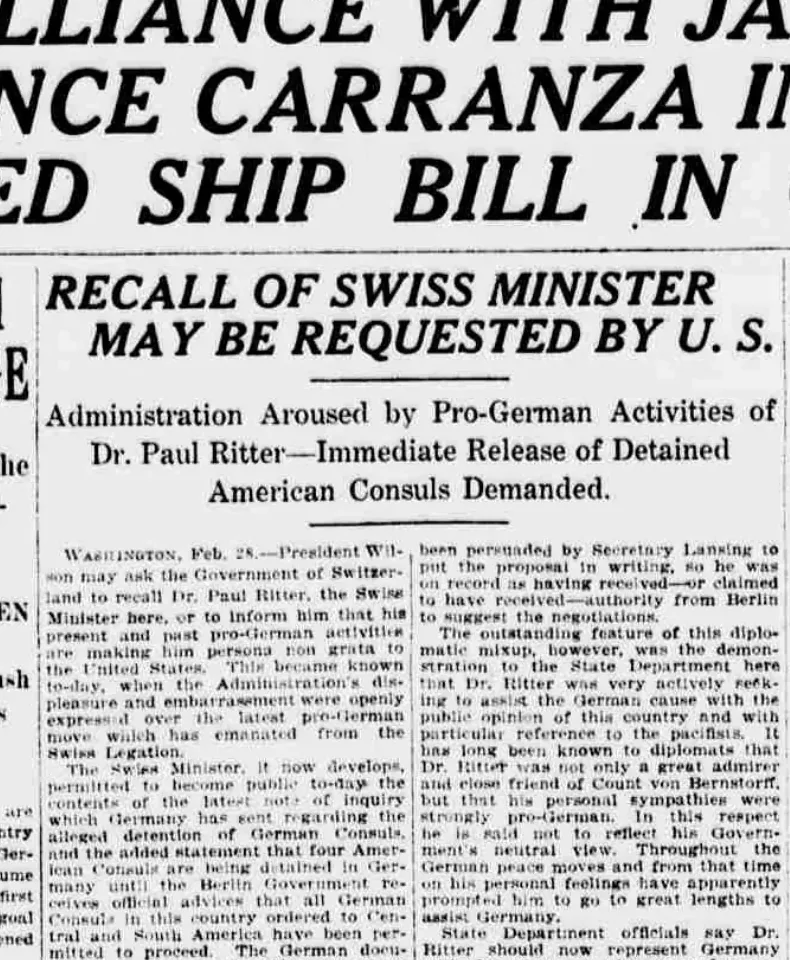 On 1 March 1917 The Sun ran the headline: “Recall of Swiss Minister may be requested by U.S. Administration Aroused by Pro-German Activities of Dr. Ritter”. Ritter now stood in the American public sphere as a problem case.